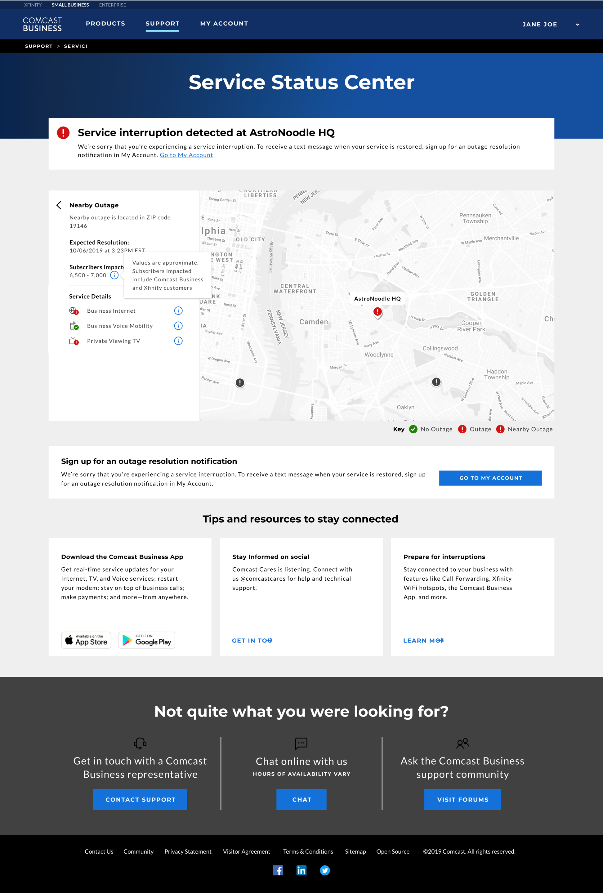Service Status Center represents the Comcast Business brand pillars of being Practical (maximizing efficiency through thoughtful and comprehensive digital self-service), Personal (products built from a deep and dynamic understanding of business customer needs and deadlines), and Bold (game-changing customer experiences that afford control while also expanding access). In this way, Comcast is fulfilling the promise of being future forward and powering the possibilities of business owners, helping to keep them on track, even during these unprecedented times.